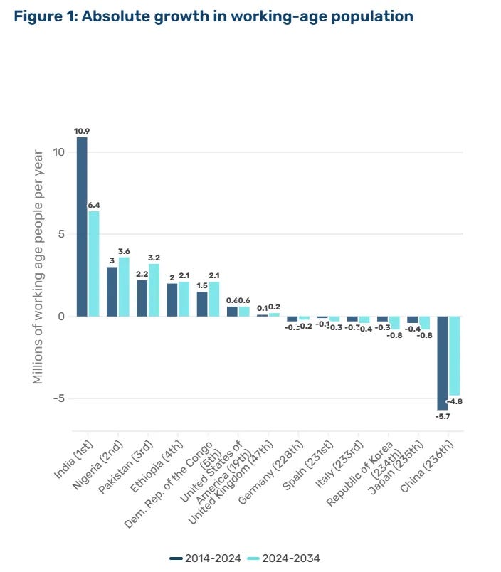 India paces the leaderboard in working-age growth, while China (and other parts of East Asia), plus Western Europe lead the decline.
