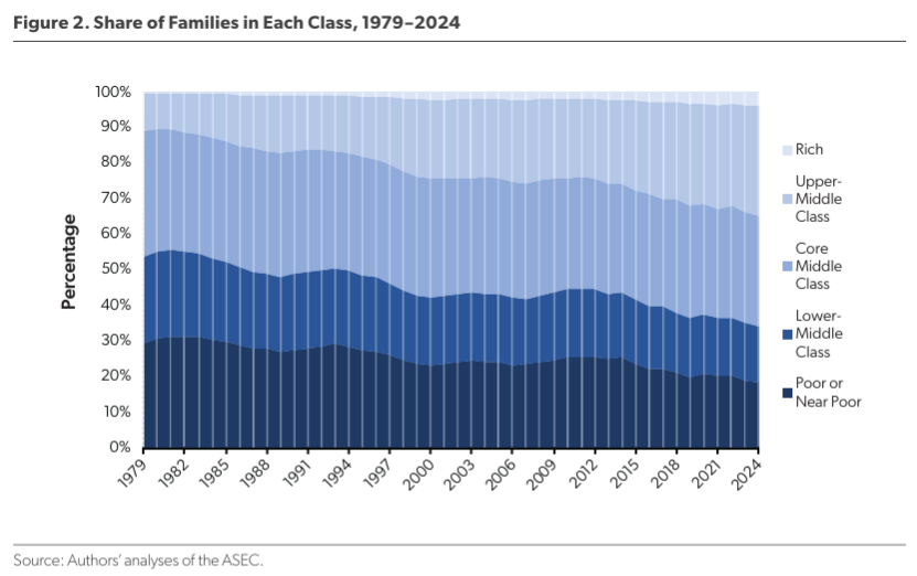 The “upper middle class” has roughly tripled its share of families since 1979, while middle, lower, and poor classes keep shrinking.