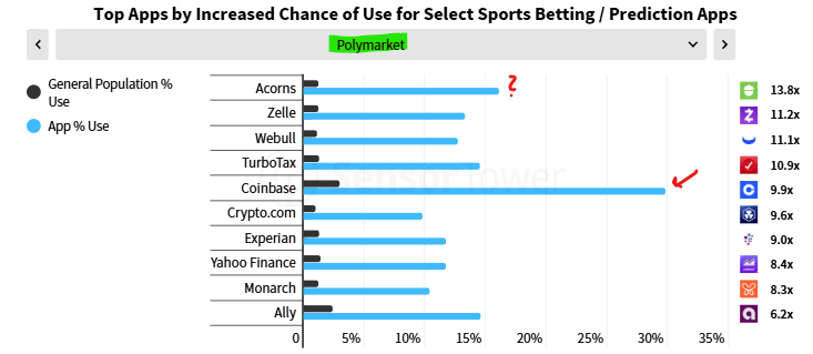Polymarket users have a lot of crossover with Coinbase (10x) and (weirdly) Acorns (14x), the relatively small roboadviser that you just don’t hear much about these days.