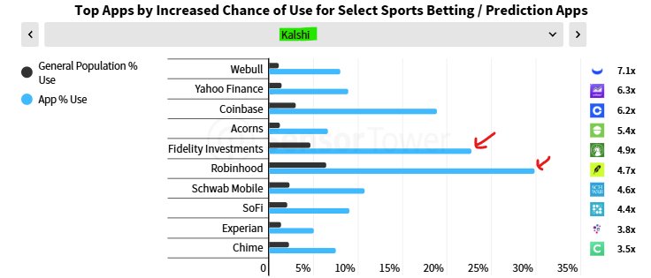 Kalshi users have a lot of crossover with Fidelity and Robinhood (~5X the general population), two leading e-brokers.