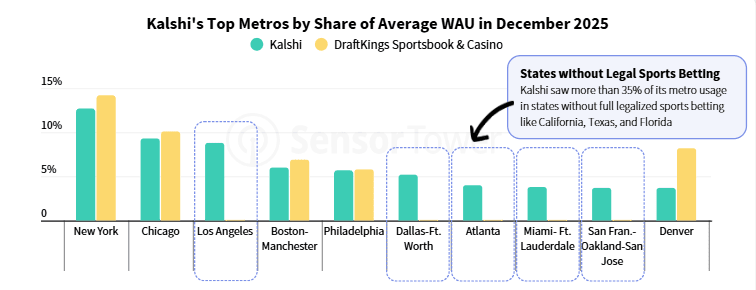 Kalshi generates ~35% of its metro userbase from markets where sports betting is not (yet) legal.