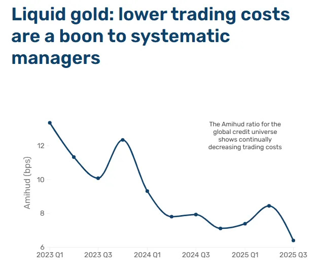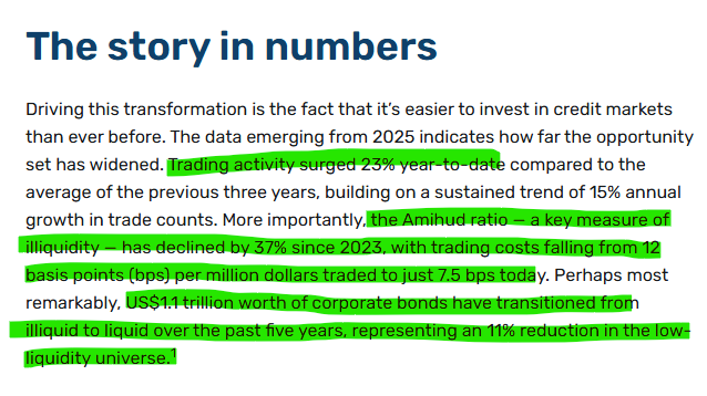 A ~40% decrease in trading costs has unlocked ~$1.1 trillion in previously illiquid corporate bonds, ārepresenting an 11% reduction in the low-liquidity universe.ā