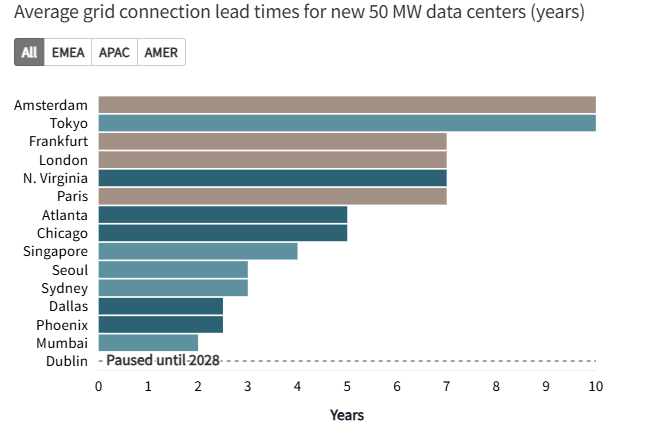 Average lead times for Data Center grid connections range from 2 years to never (in the case of Dublin).