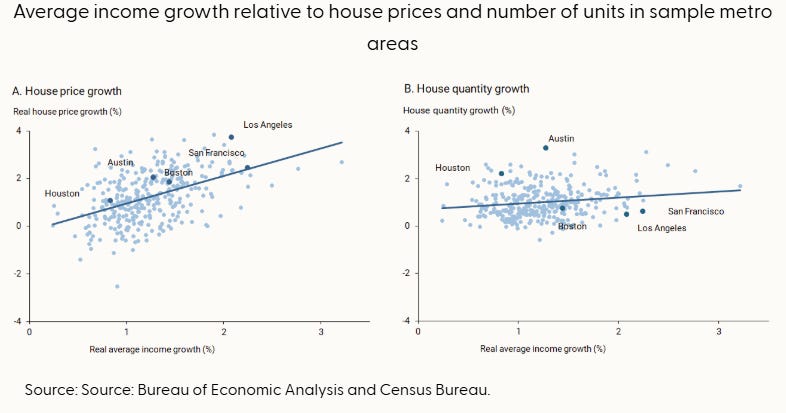 panel B shows little connection between average income and annualized growth in housing supply . . . [s]ome metro areas experience high income growth but little growth in housing supply while others experience relatively little growth in income and large growth in quantities . . . as income grows, there may be little effect on the demand for housing supply. If we control for population growth, there is essentially no relationship between the two.