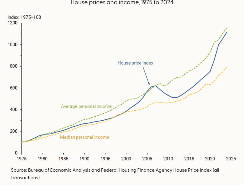 . . . Average income, an indicator of housing demand (green dashed line), grew essentially one-for-one with house prices from 1975 to 2024, even though median income failed to keep up.