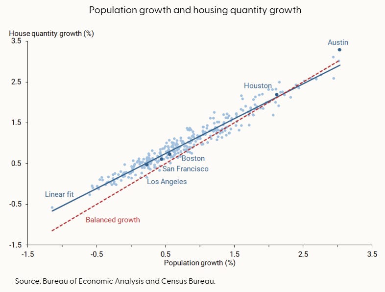 [A]bout 85% of metro areas had more growth in housing quantities than in population; this is shown by most of the data lying above the dashed red ābalanced growthā line, which indicates the housing growth rate that would match population growth with no change in average household size.