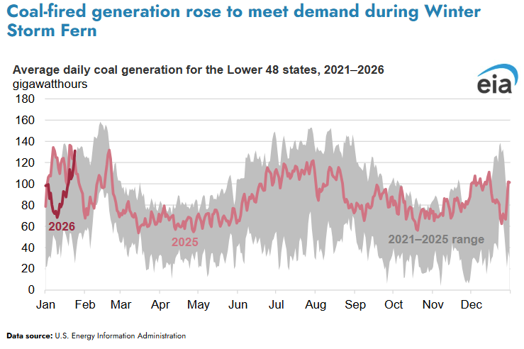 In the week ending January 25, 2026 [of Winter Storm Fern] . . . coal-fired electricity generation in the Lower 48 states increased 31% from the previous week . . . natural gas generation in the Lower 48 states increased 14% from the previous week while generation from solar, wind, and hydropower declined. Nuclear generation was nearly unchanged.