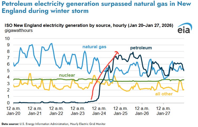 When Winter Storm Fern affected New England this week, petroleum was the predominant energy source starting around midday on January 24 and lasting until early morning on January 26. Since then, petroleum and natural gas have been fluctuating as the primary energy source.