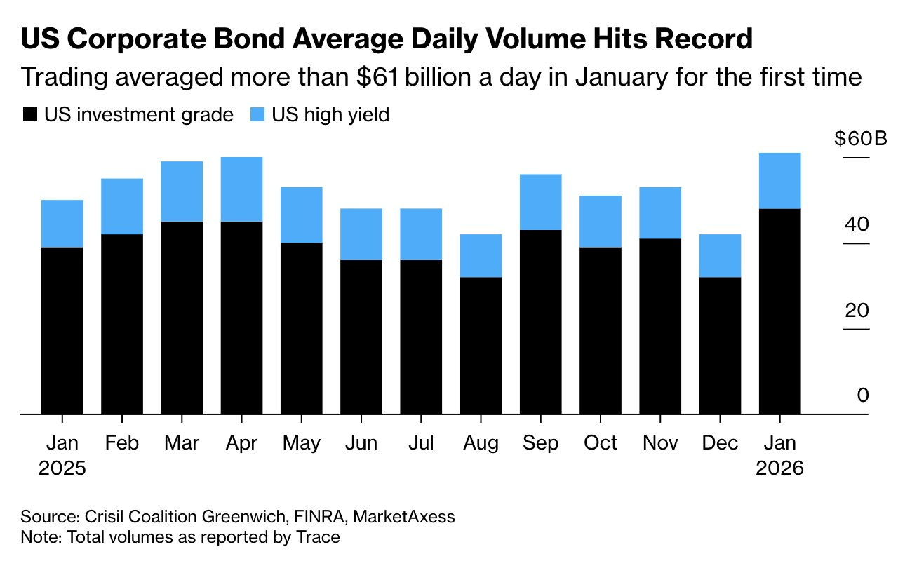 More than $61 billion of US corporate bonds traded per day on average in January . . . That’s 11% hotter than at the same point in 2025 . . .