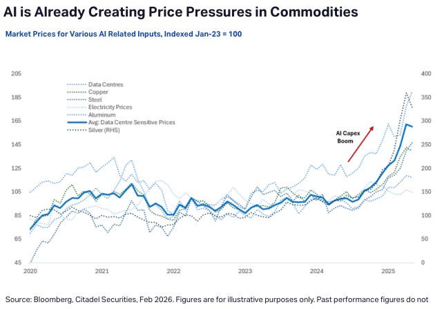 The price of commodities have risen dramatically—silver even needs its own axis.