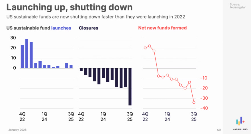“Sustainable” funds in the US are in die-out mode, with fund closures outnumbering fund launches by ~35.