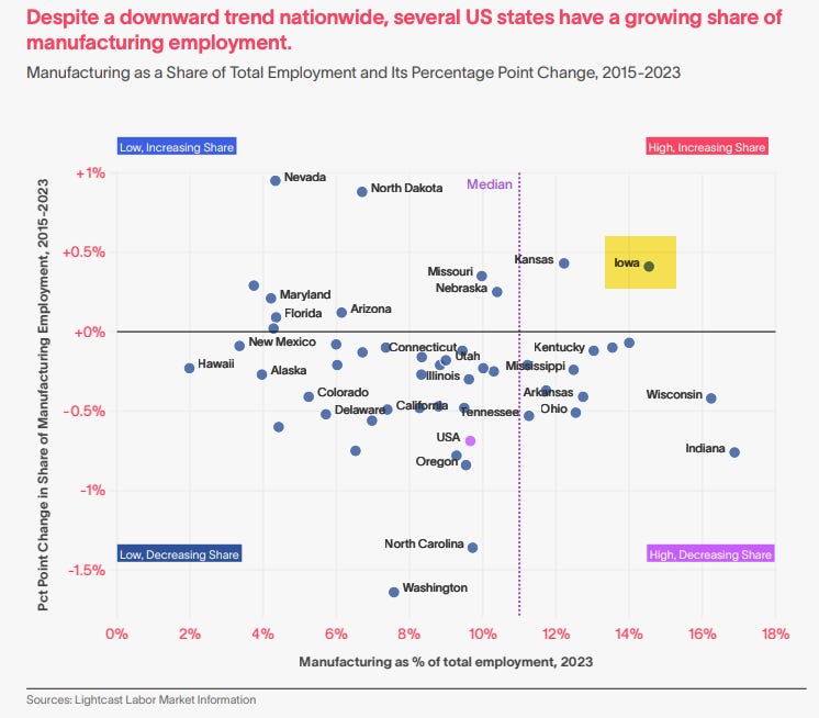Iowa has the third largest in-state share of manufacturing employment, and it’s growing.