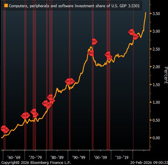 Tech hardware and healthcare service spending are both at all-time-highs, as a share of overall GDP.