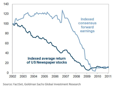 Newspaper stock prices began their decent about 5 years before Newspaper earnings collapsed.