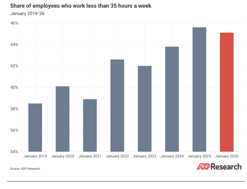 The share of employees that are part-time (i.e. work fewer than 35 hours/week) is ~45%.