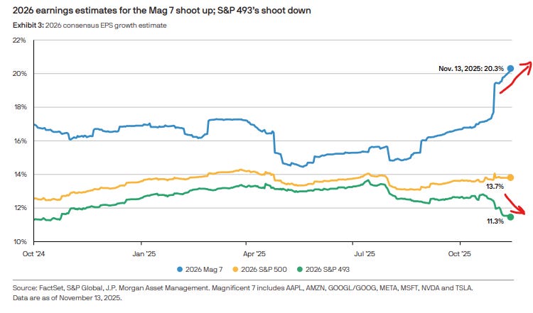 Earnings growth for the rest of the index isn’t expected to be bad, but it’s slower than before. But for those “Mag 7” names, earnings are expected to grow an extraordinary ~20%. That 20% reflects a substantial acceleration from the already impressive growth demonstrated by the largest profit-making companies the world has ever known.