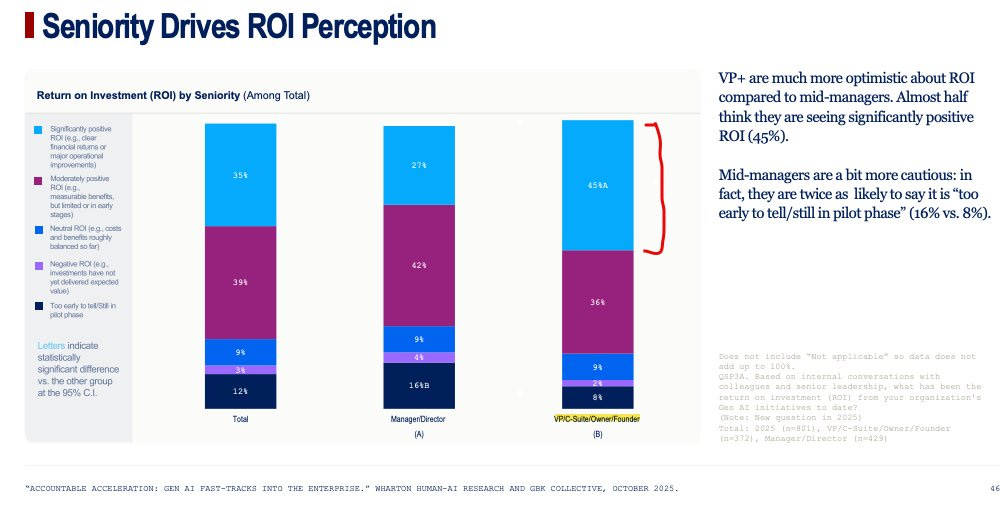 Senior management is way more bullish on AI ROI than middle managers, but everyone is still pretty bullish.