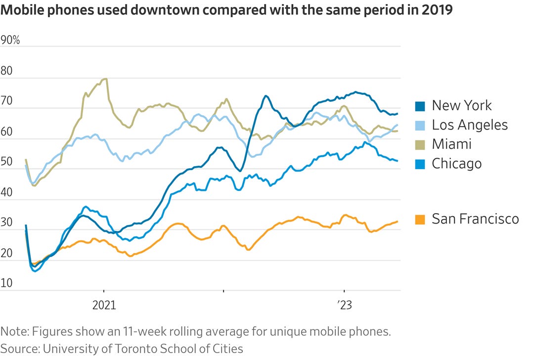 I’m not entirely sure of what’s driving the difference between the two data sets, but one obvious possibility is that they’re not really measuring the same thing. The number of cell phones downtown includes tourists, as well as remote/hybrid workers who just aren’t coming into the office. Card swipes are just office workers, and really nothing else.