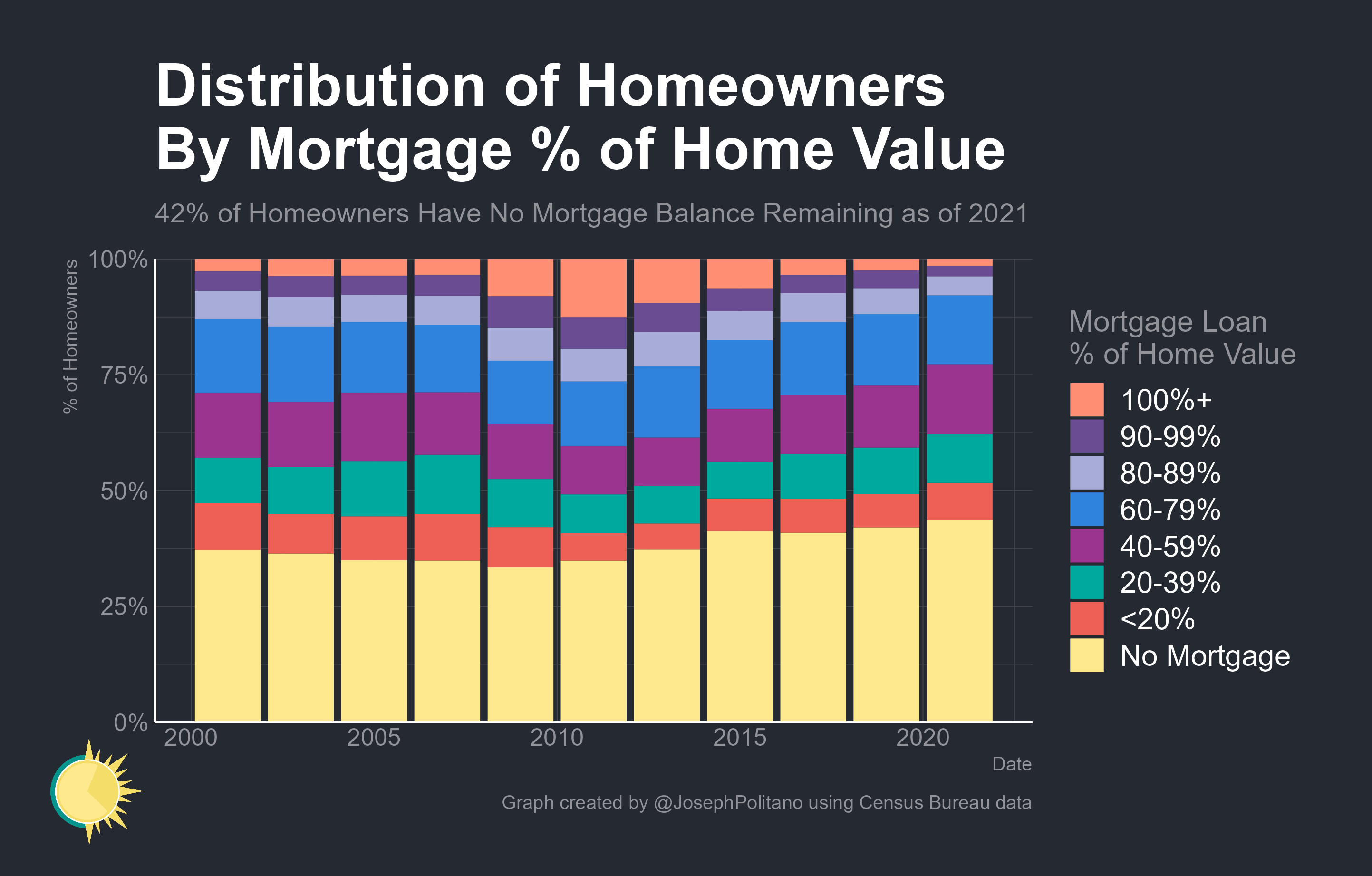 points out that, contra-lock-in, nearly 42% of homeowners have no mortgage at all, and another ~20% have very little mortgage left:You can’t be locked-in by a mortgage you don’t have.