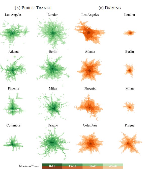 It stands to reason then that maximizing the amount of shelter within range of “one hour commuting,” and/or maximizing the range of the one hour commute, would be good things. Some intrepid researchers attempted visualize how well certain cities in both Europe and the United States did precisely that, and whether the commute range was accomplished by car, or by public transit.