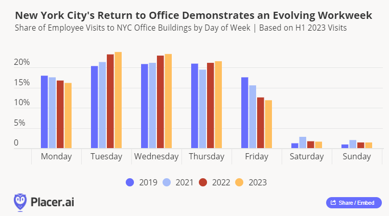 In NYC at least, a hybrid Tues-Wed-Thursday schedule seems to be the most popular, with those days capturing an increasingly large share of office visits (says the footfall data at least):