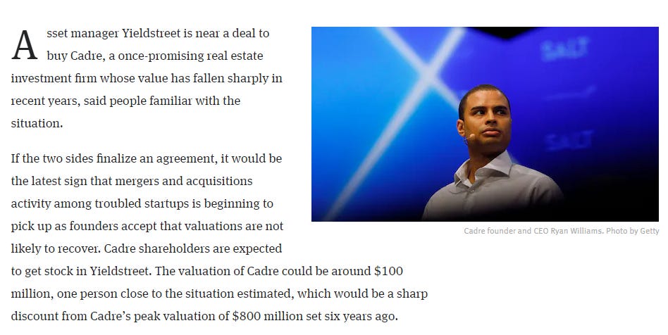Personally, I’d put Cadre in that bucket. Cadre is a platform for real estate investing, giving users the opportunity to “invest alongside institutions.” It’s being sold (maybe) to another alternative investment platform, Yieldstreet, for what is likely something slightly more than parts.