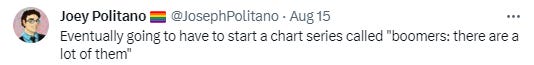 The truth is that the most likely inference one can draw here is that Boomers own a lot of homes and they really don’t sell very often—as per last week, we’ve been increasingly sedentary for a while.2 Mr. Apricitas quipped: