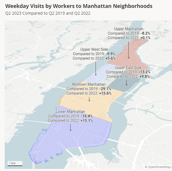 Midtown has the most longer-distance commuters (followed by Lower Manhattan) and it lags the overall recovery by quite a bit.3