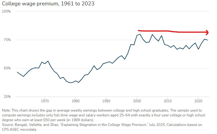 The college wage premium is still high, but it hasn’t been getting any higher for some time.