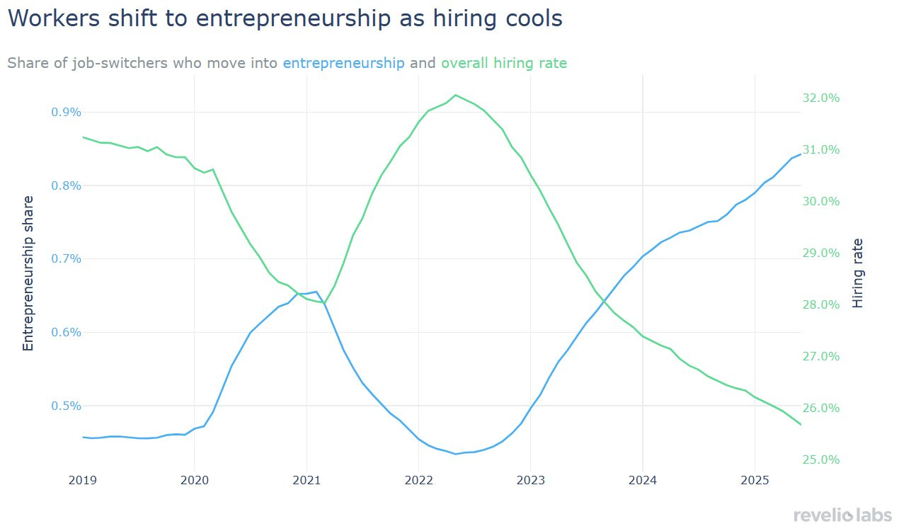 Entrepreneurship rates have skyrocketed, in an almost perfectly inverse relationship to the hiring rate.