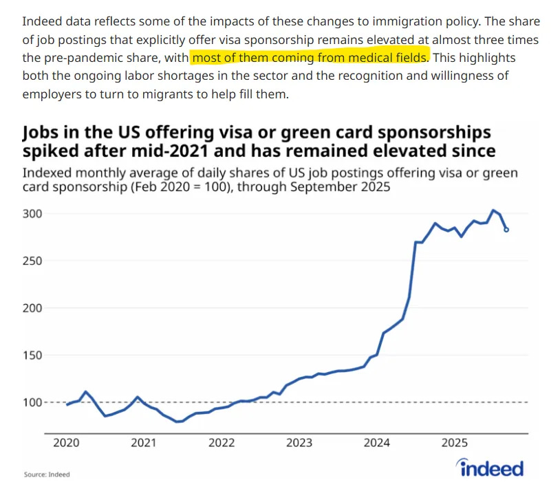 As Indeed points out, “most of [these job postings with visa or green card sponsorship are] coming from the medical fields.”