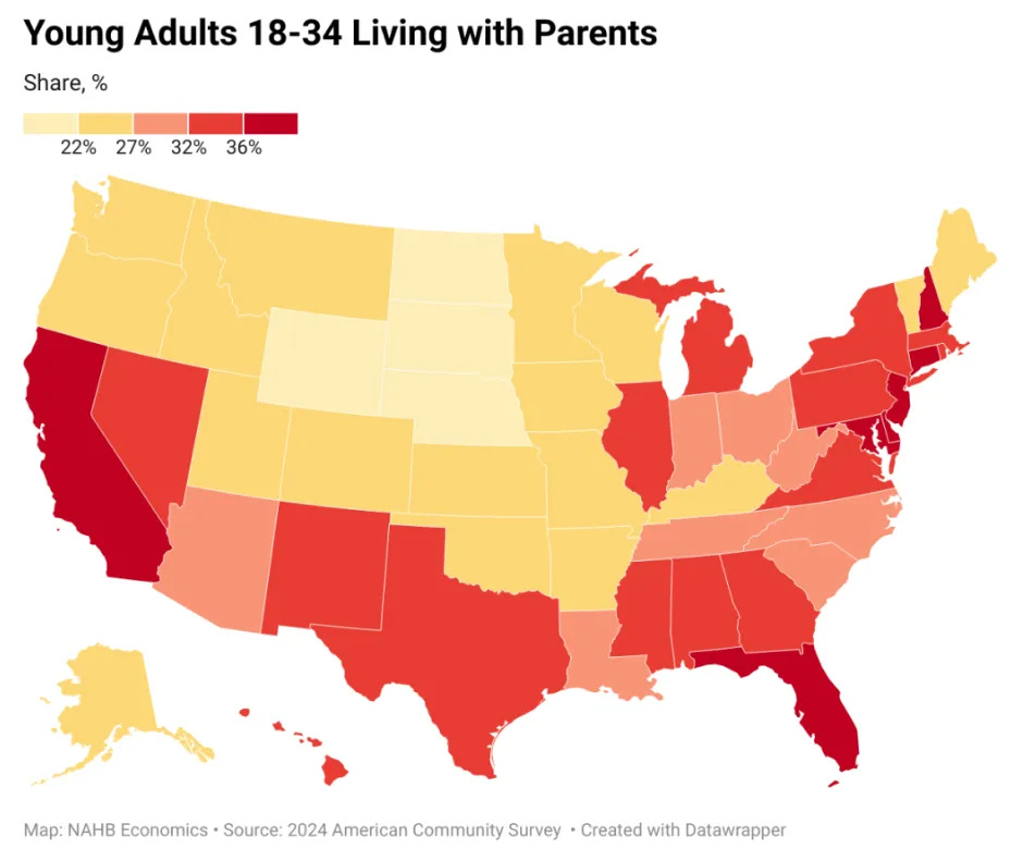 The share of young adults living with their parents is ~40% (and as high as 44%) in the coastal bastions.