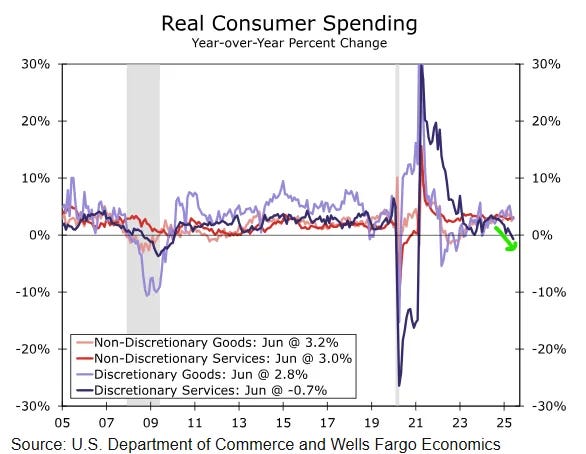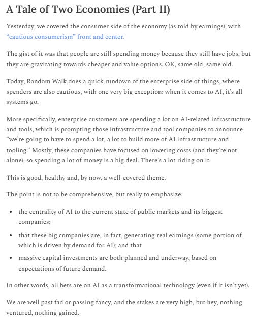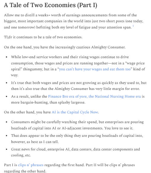 Not to pick on Derek Thompson, who seems like a genuinely smart and thoughtful fellow, but you’ll see why I’m irked. Last week he did a “did you know that all the jobs are healthcare jobs?” (which yes, around here, we know), and then this week he came back with “the economy is splitting into two, there’s a rip-roaring AI economy. And there’s a lackluster consumer economy.”