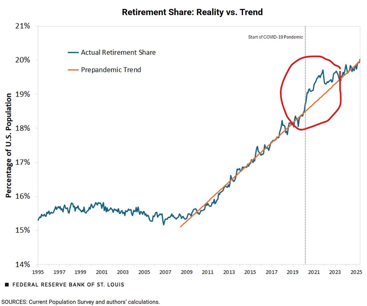 Pandemic ‘pull-forward’ of retirement, particularly among no-college ‘blue-collar’ workers via St. Louis Fed