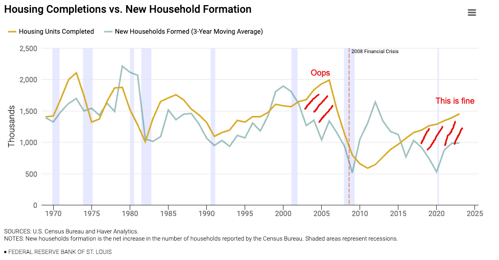 Outside of a little pre-GFC overbuilding, followed by some under-building, completed housing units have tracked household formation pretty darn closely.
