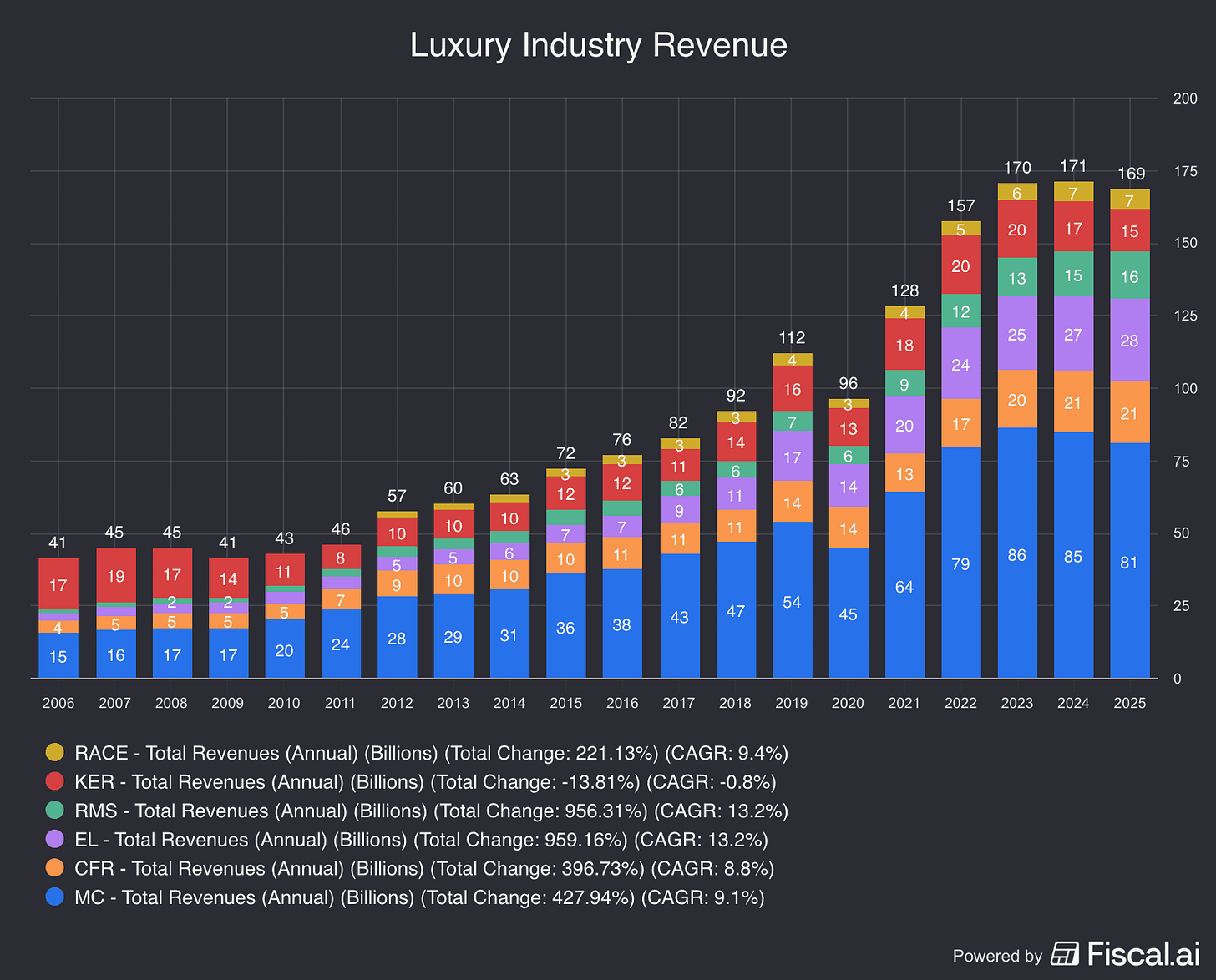 Luxury revenues have been trending flat-to-down off their peak, since ~2023.