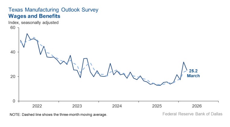 The Dallas Fed survey shows steady upward inflection of wage growth for manufacturing since the end of ‘25.