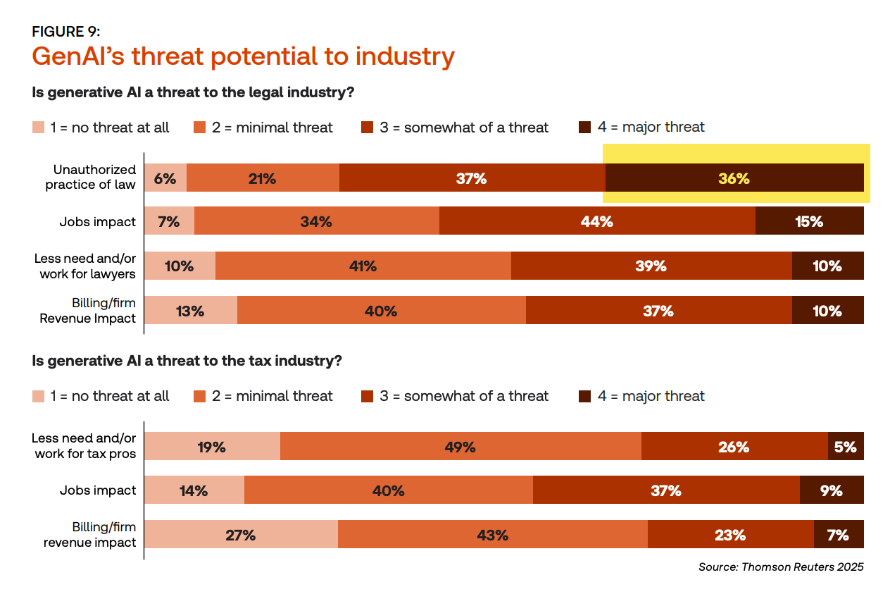 73% said the “unauthorized practice of law,” was somewhere between “major threat” and “somewhat,” but, in all events, the biggest threat.