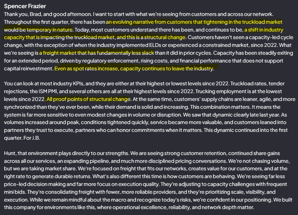 Now, JB Hunt is talking his book. Plus, a lot of the commentary is specific to the structural changes in freight—yes, there is an uptick in demand, but there are other reasons that freight supply has decreased.
