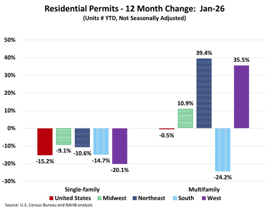 Single-family permitting is down everywhere (after a big run of building, and now soft demand), while multifamily perks up (after a lull in building, precipitated by stagnant rent-growth).