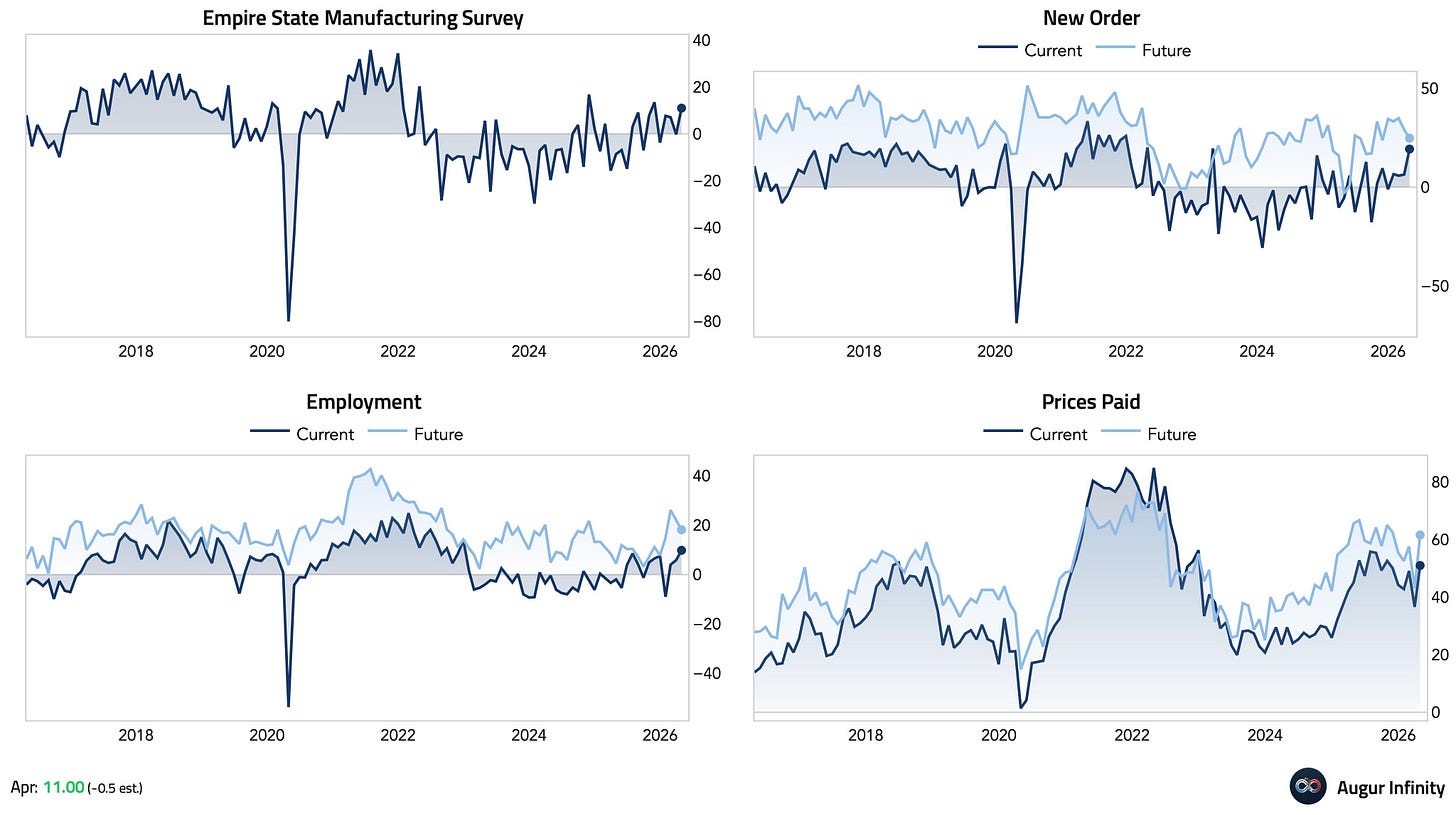 Empire State manufacturing Survey, showing a big jump in new orders, employment, and prices paid: