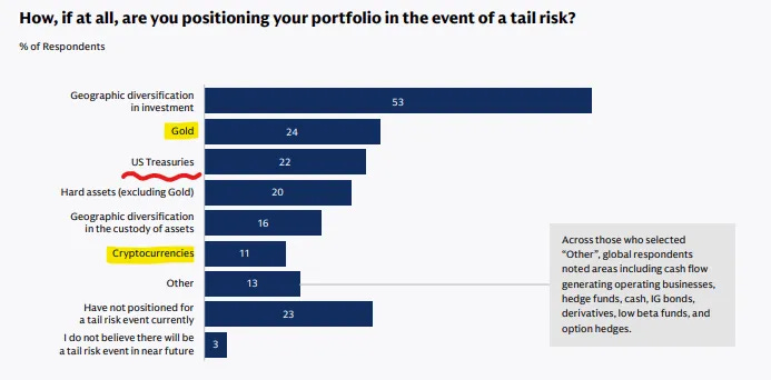 Geographic diversification is the biggest hedge, but a quarter said gold, a fifth said UST, and 11% said crypto.