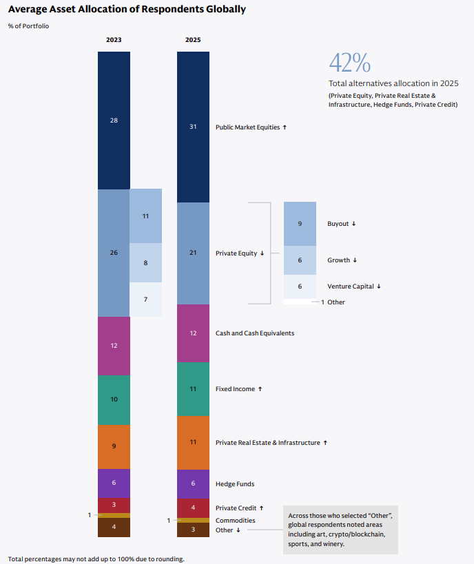 Allocations have shifted away from PE/VC, but only by 5 percentage points from 2023.