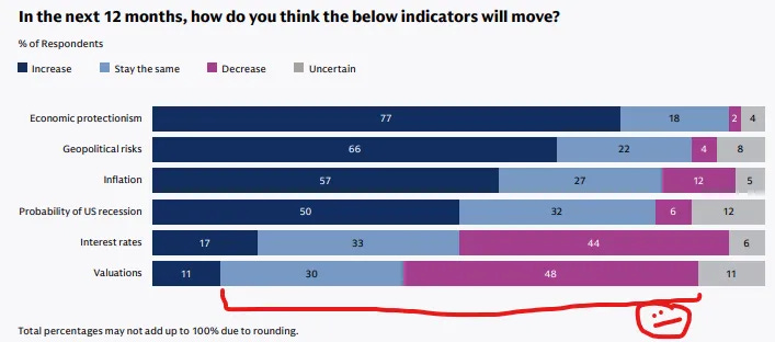 Nearly 80% of respondents expect valuations to stay flat or decrease—with just under a majority saying valuations will “decrease.”