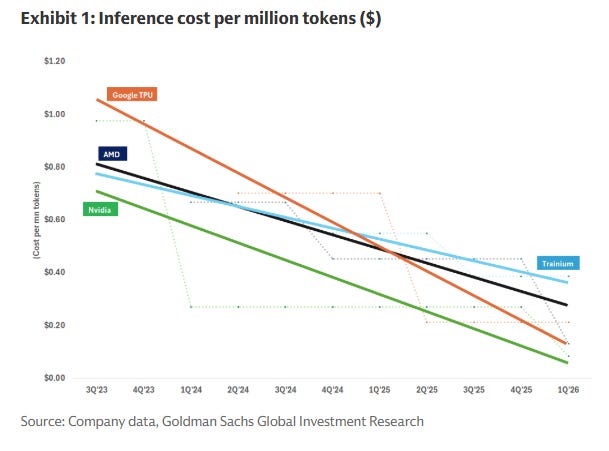 Nvidia’s chips are getting the cheapest, but Google’s TPUs are cheapafying at the quickest rate. AMD is the laggard.