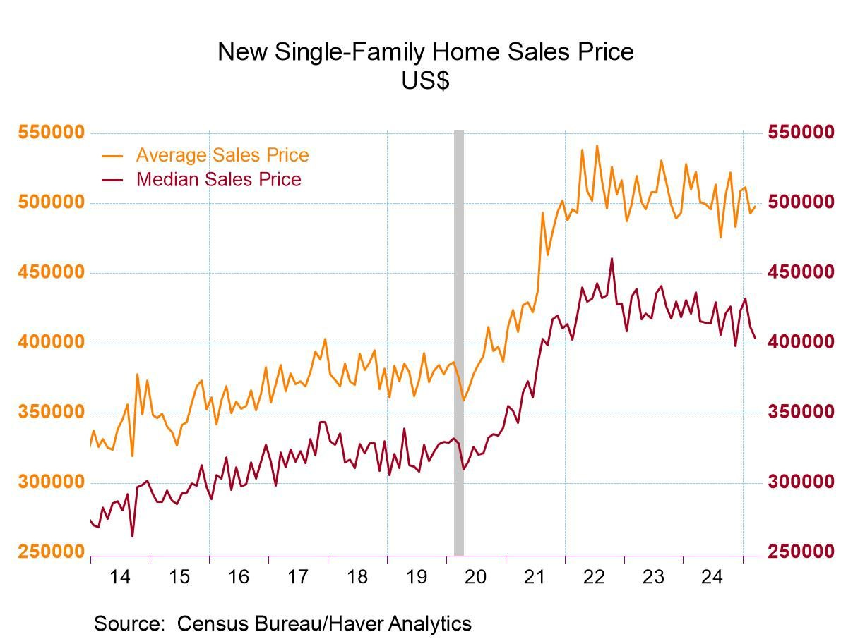 Median (and average) new home sales prices have been in steady decline since their pandemic highs.