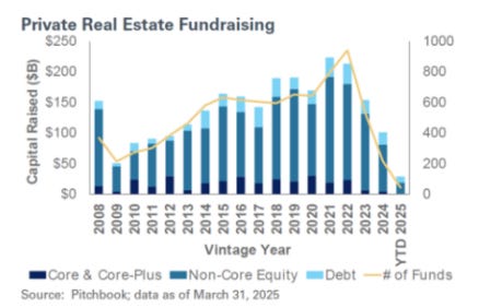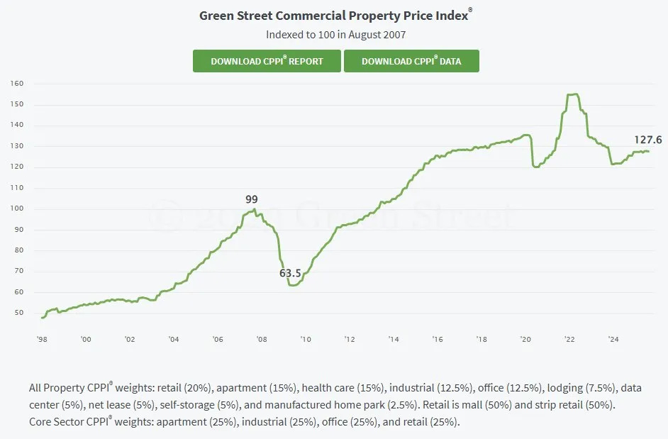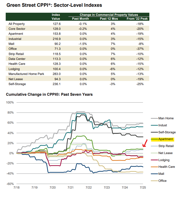 Green Street’s commercial property price index shows property values lower than before the pandemic, with residential assets specifically, a bare 10% more pricey than they were seven years ago (and 20% lower than their pandemania peak).