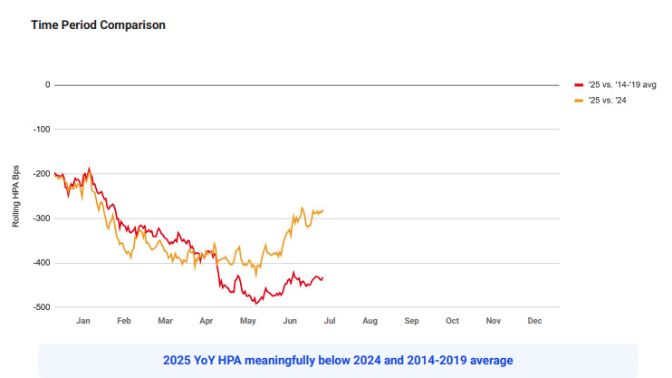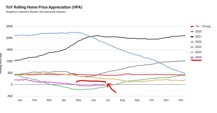 Opendoor shows negative price appreciation, trending lower than last-year, and much lower than the post-GFC average.