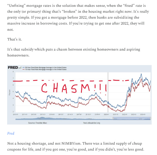 If you wanted to “fix” the housing market, the correct and effective solution would be to convert 30-year mortgages into floating rate or shorter-term fixed mortgages. If you did that, homeowners would be forced to internalize higher borrowing costs, and they would be much more inclined to sell—at prices that would actually reflect prevailing borrowing costs.