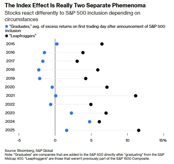 “Graduates” get a moderate lift when they get added to the S&P500, but “leapfroggers” absolutely rip.